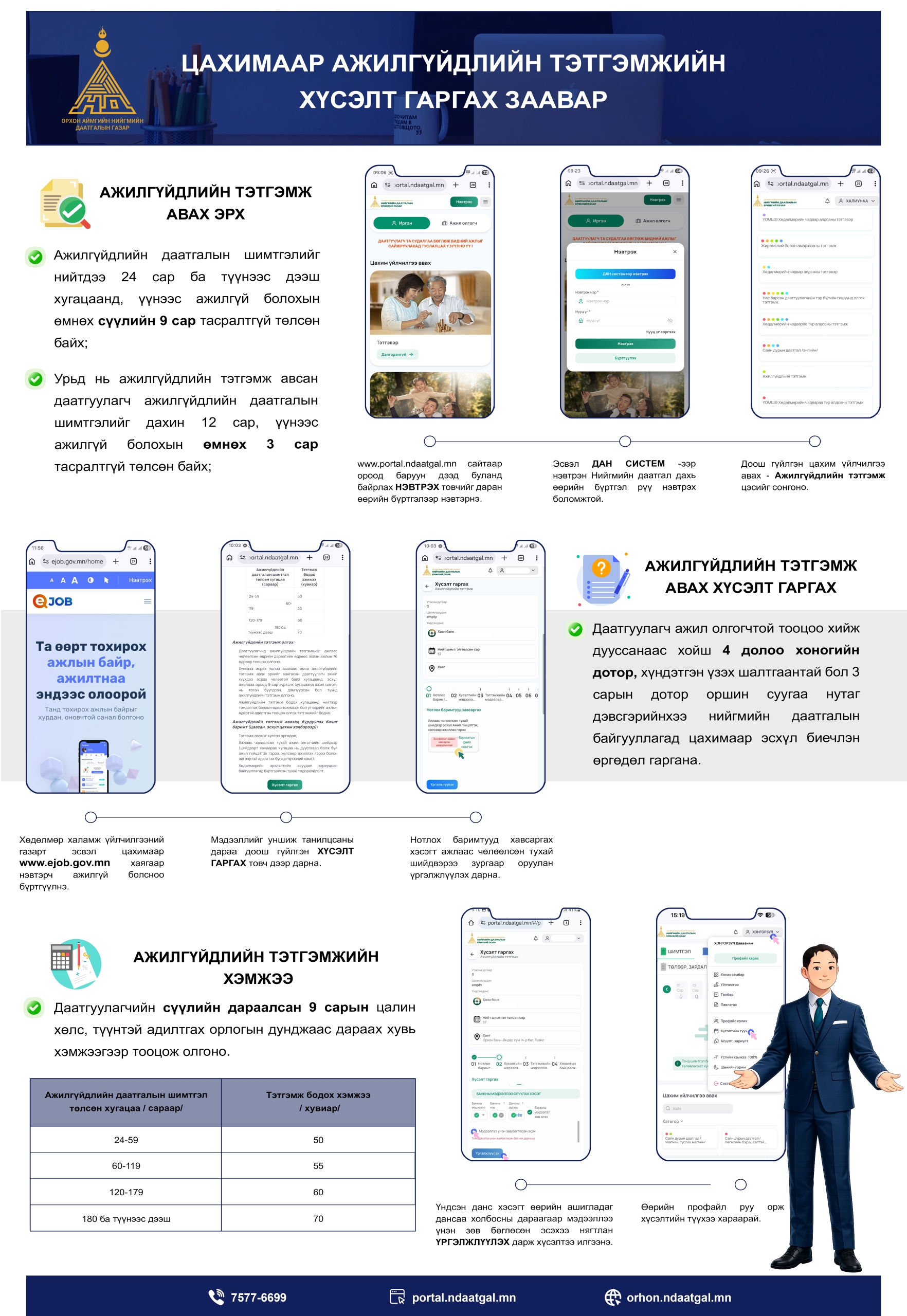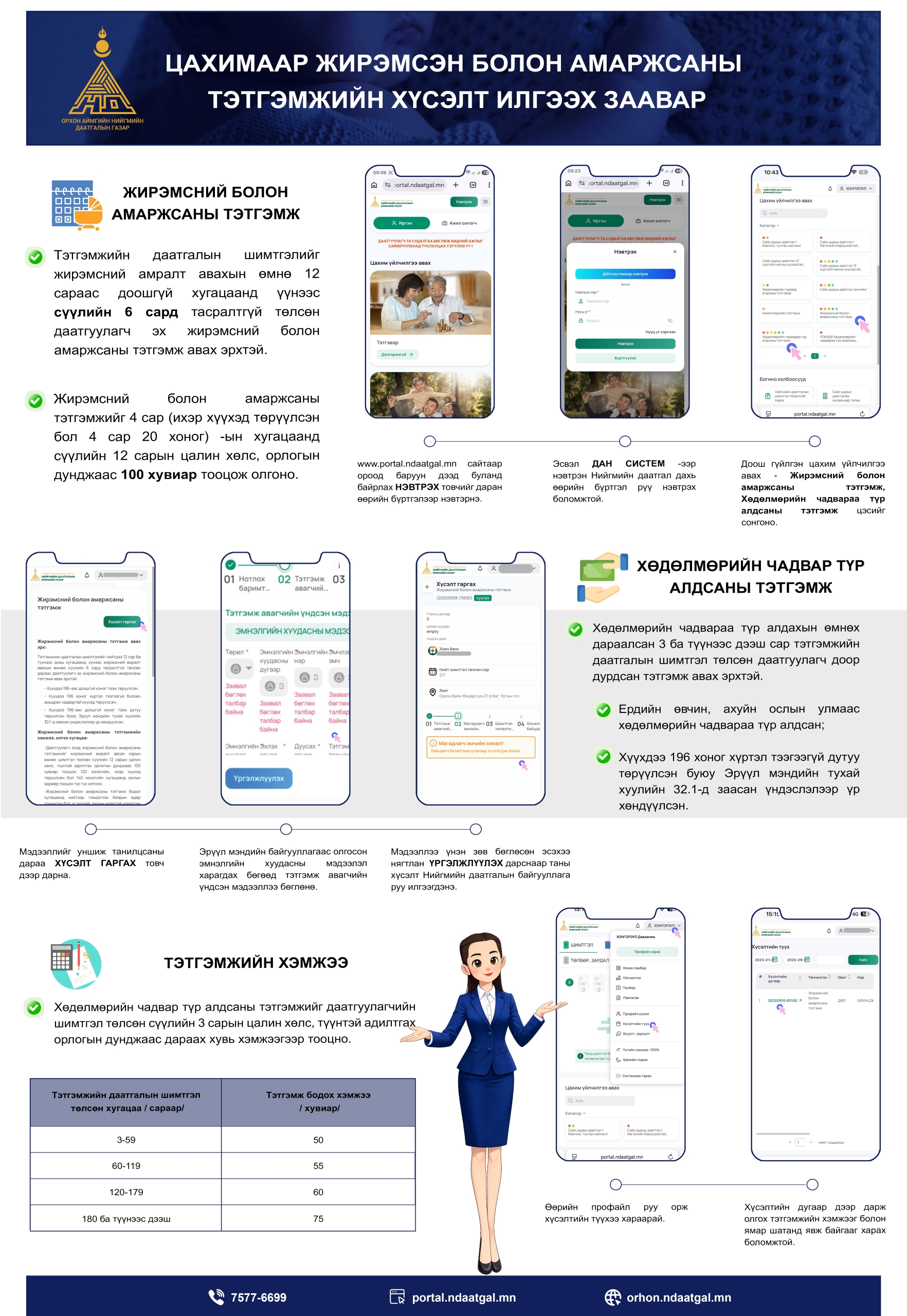 iOS болон Android үйлдлийн системтэй гар утсаа ашиглан, хүссэн газраасаа бүртгүүлж, нийгмийн даатгалын үйлчилгээг авах боломжтой.