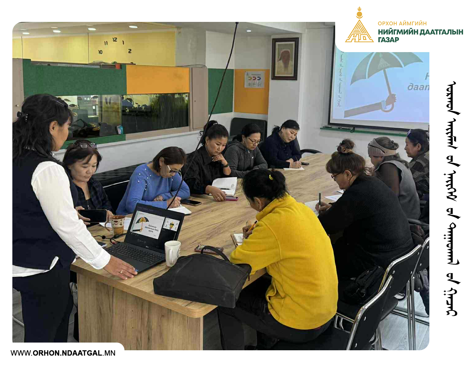 ”ИТГЭЛЦЛИЙН АЯН”-ны хүрээнд “Нийгмийн даатгалын багц хууль”-иар Орхон аймагт үйл ажиллагаа явуулж буй СӨХ-үүдийн захирал албан хаагч, ажилчдын дунд сургалт зохион байгуулж, зөвлөгөө мэдээлэл хүргэлээ.