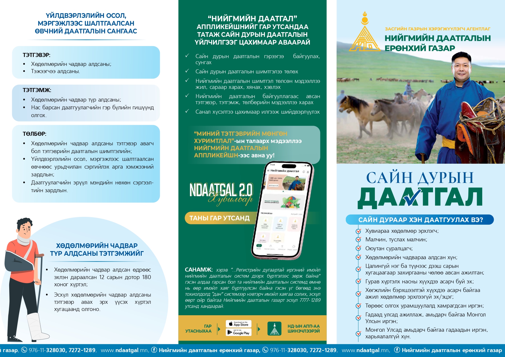 - Даатгуулагчийн эрүүл мэндийн нөхөн сэргээлтийн зардлын төлбөр.