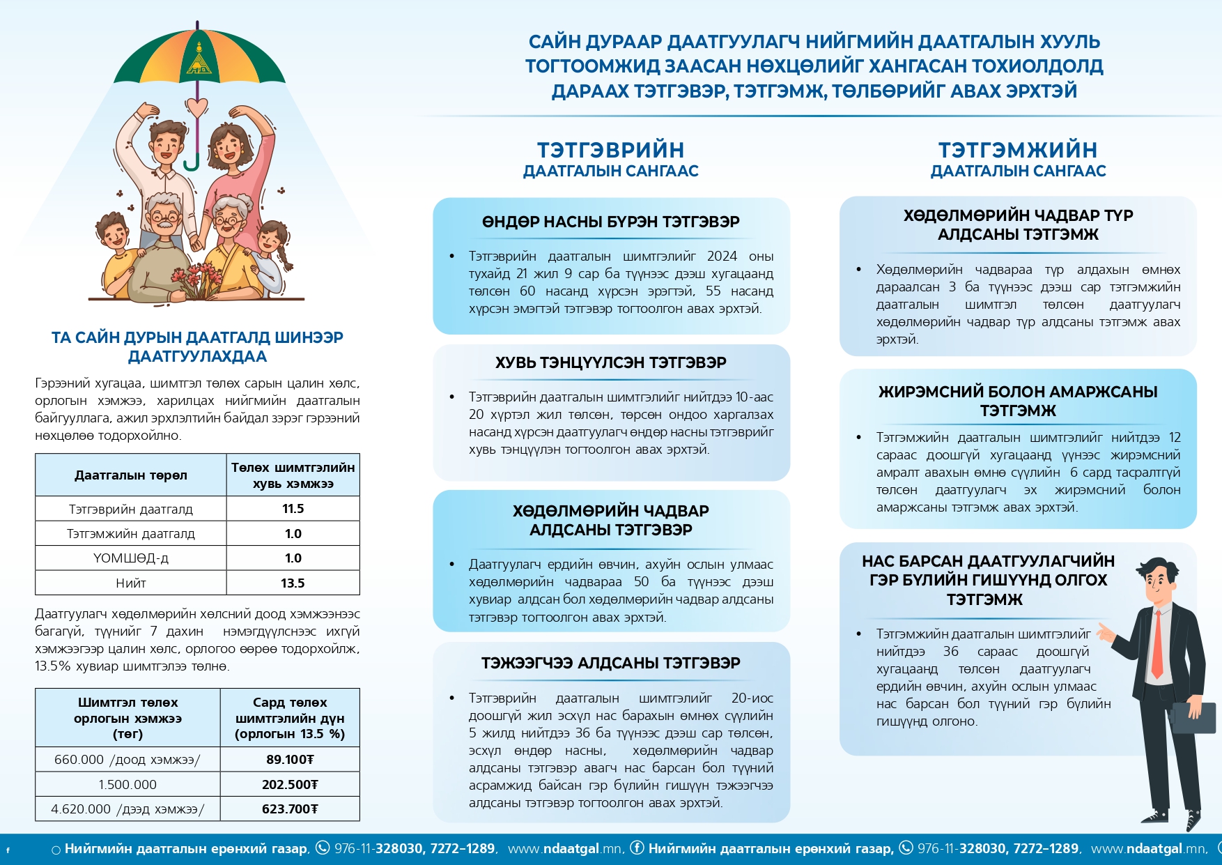 Тэтгэврийн даатгалд төлөх шимтгэлийн хувь хэмжээ 11.5% Тэтгэмжийн даатгалд төлөх шимтгэлтийн хувь хэмжээ 1.0% ҮОМШӨ-ний даатгалд төлөх шимтгэлийн хувь хэмжээ 1.0% Нийт дүн 13.5% САЙН ДУРЫН ДААТГАЛ
