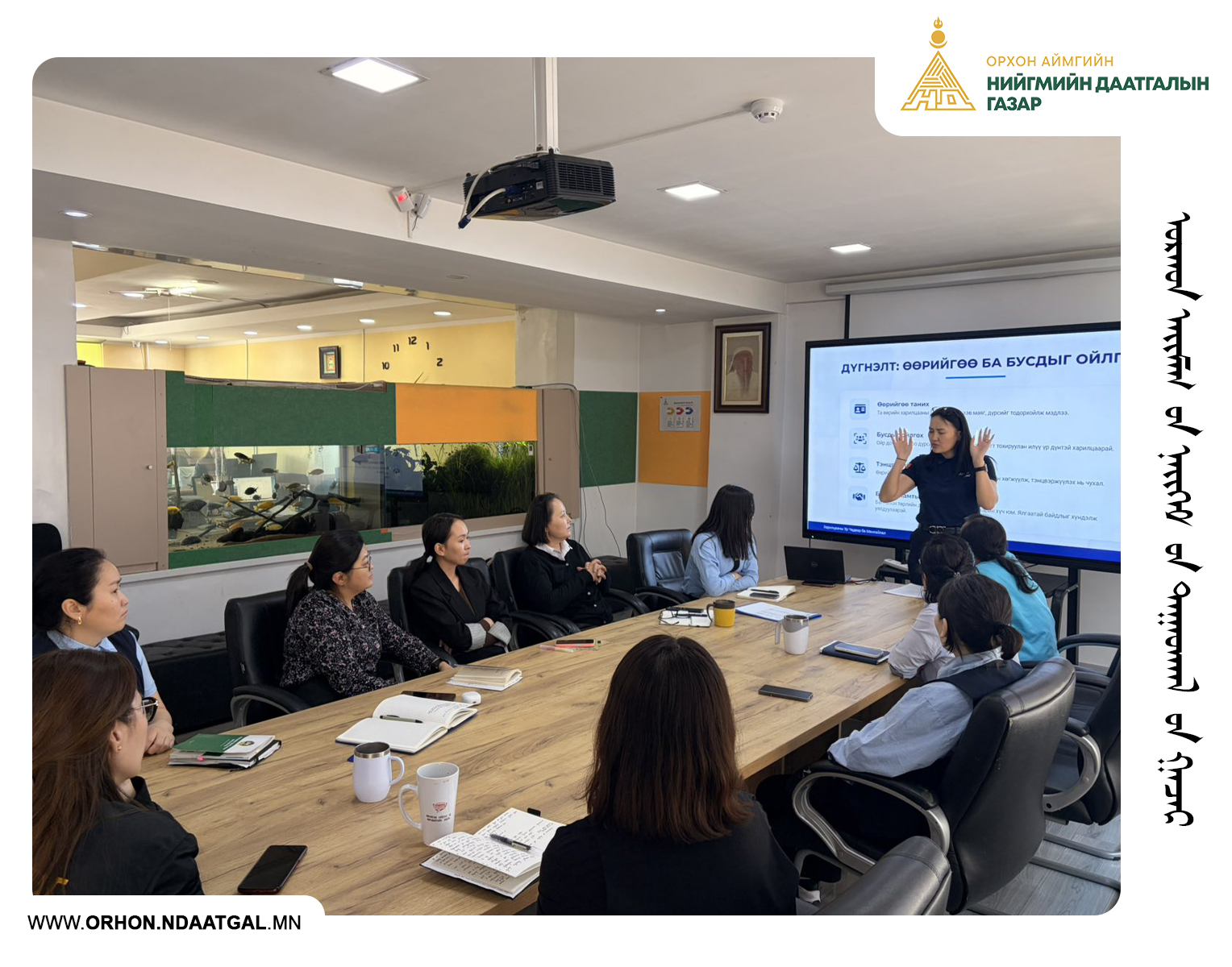 Орхон аймаг СУАЖЗ-ын газрын Зорилтот бүлгийн залуучууд, сургалт хариуцсан мэргэжилтэн Г.Мөнхзул “Харилцаа ба манлайлал” сэдвээр сургалт зохион байгууллаа.