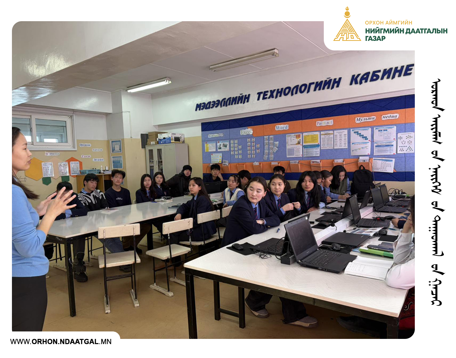 Орхон аймгийн 17 дугаар сургуулийн ахлах ангийн сурагчдад ‘Даатгалтай ирээдүй’ сэдвээр сургалт зохион байгуулж, нийгмийн даатгалын ач холбогдол, нийгмийн даатгалын цахим үйлчилгээний талаар сурталчлан таниулж ажиллалаа.