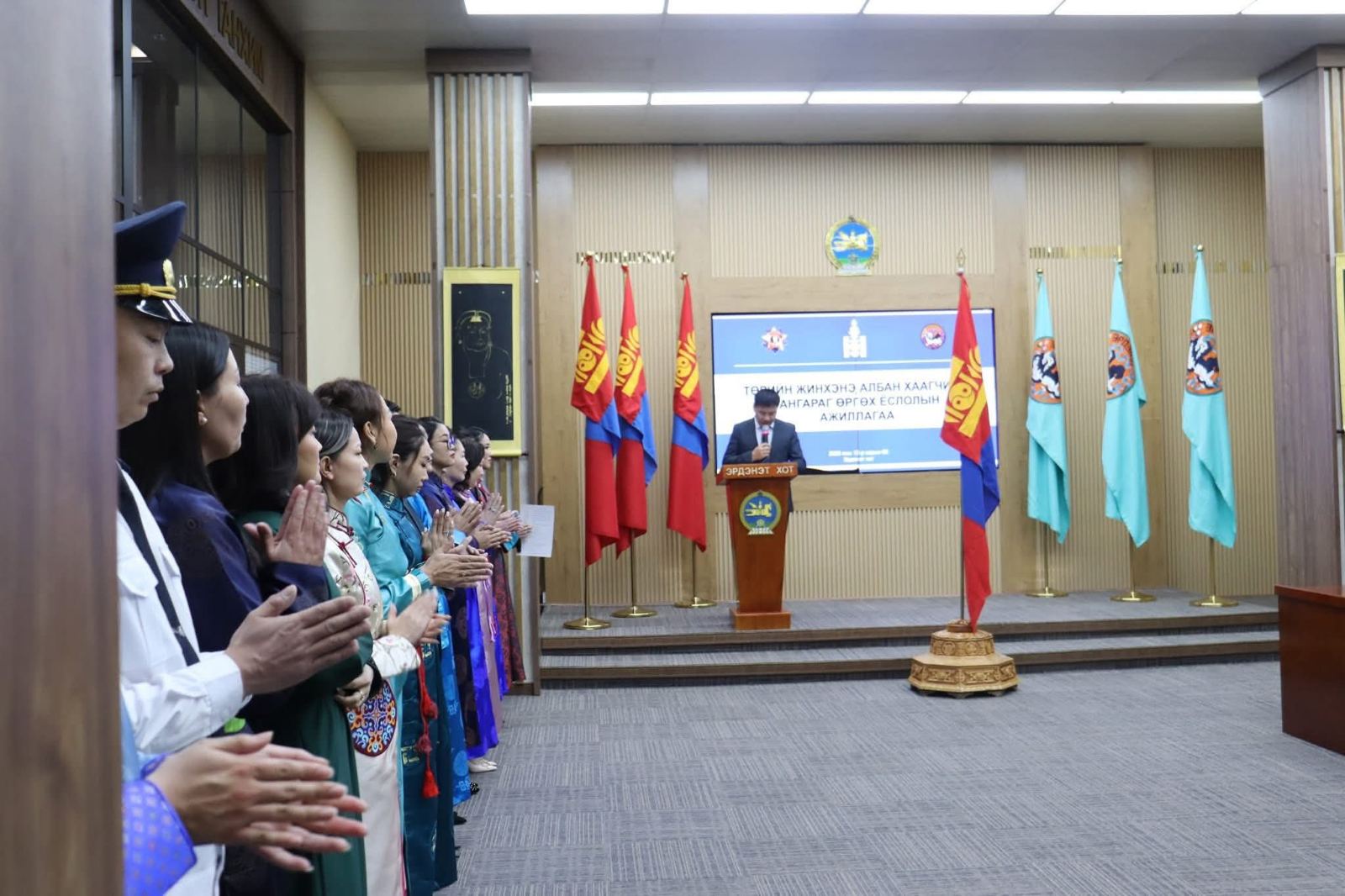 Жил бүрийн арванхоёрдугаар сарын 11-нд тохиодог “Эрдэнэт хотын өдөр болон Анхдагч илгээлтийн эздийн өдөр”-ийг угтсан Төрийн жинхэнэ алба хаагчийн тангараг өргөх ёслолд Нийгмийн даатгалын газрын Нэг цэгийн үйлчилгээний байцаагч, мэргэжилтэн Нямдэлэгийн Сайхантуяа багтаж, төр түмнийхээ төлөө хоёргүй сэтгэлээр зүтгэхээ тангарагласан юм.