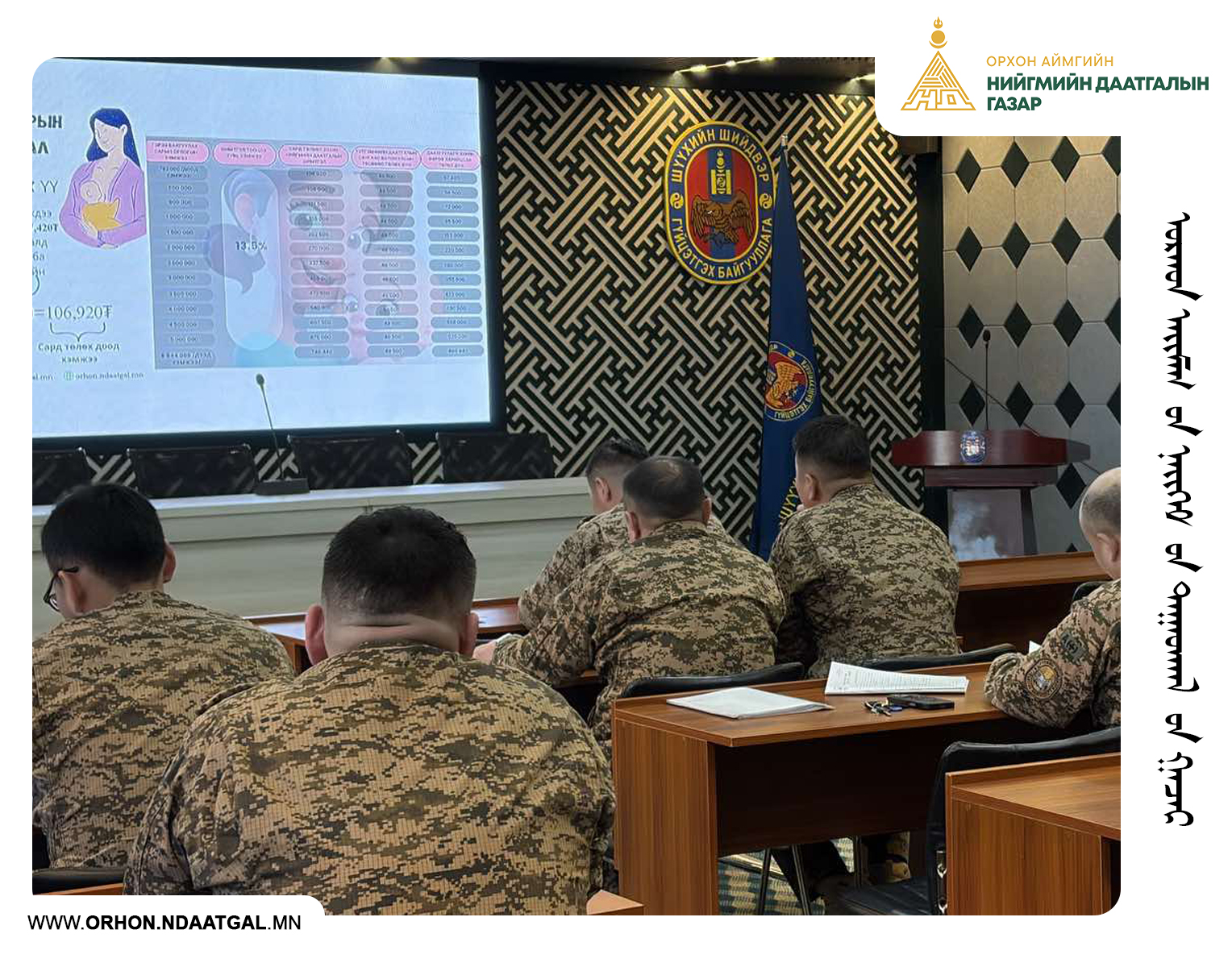 ✅Орхон аймгийн Нийгмийн даатгалын газрын тэтгэвэр тогтоолт, олголт хариуцсан улсын байцаагч О.Ганцэцэг, Сургалт сурталчилгаа хариуцсан байцаагч Н.Хулан нар Шүүхийн шийдвэр гүйцэтгэх газар-437 дугаар нээлттэй хорих ангийн албан хаагчдад “Цэргийн албан хаагчийн тэтгэвэр” сэдвээр сургалт зохион байгуулж, мэдээлэл хүргэн ажиллалаа.