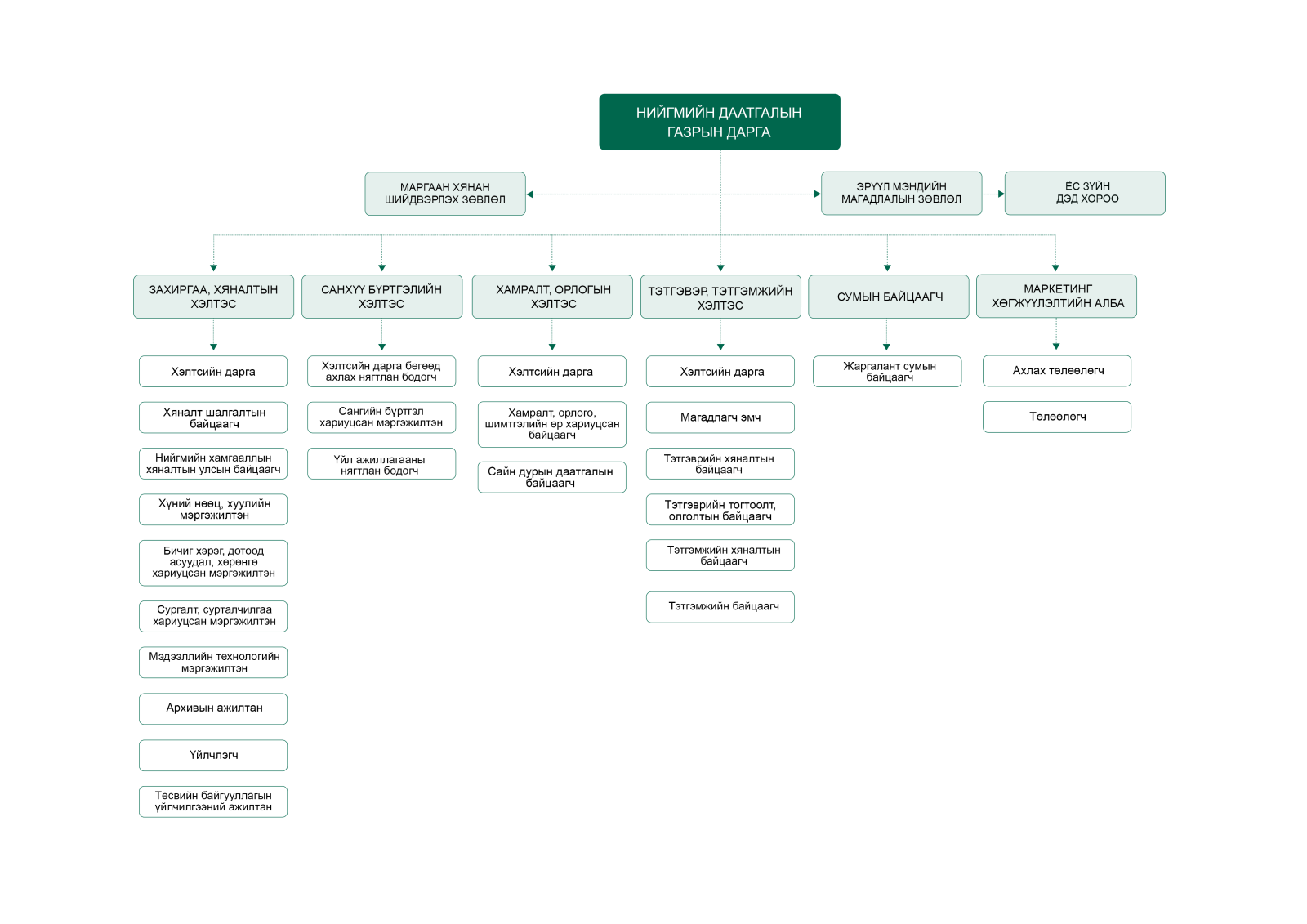 Нийгмийн даатгалын хэлтэс 2023.01.23 Даргын үүрэг гүйцэтгэгч Даваадорж Нармандах 23 Нийгмийн даатгалын газар 2024.01.01 Даргын үүрэг гүйцэтгэгч Даваадорж Нармандах ОЛОЛТ АМЖИЛТ